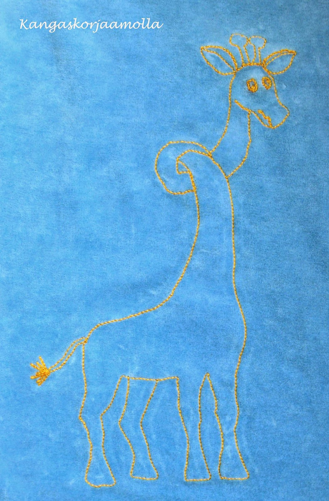 Sinisiin velourhousuihin ompelin kirahvin käyttäen helmilankaa ompelukoneen alalankana. (Ohje) Olisi kannatttanut valita räväkämpi oranssi kuviointiin.