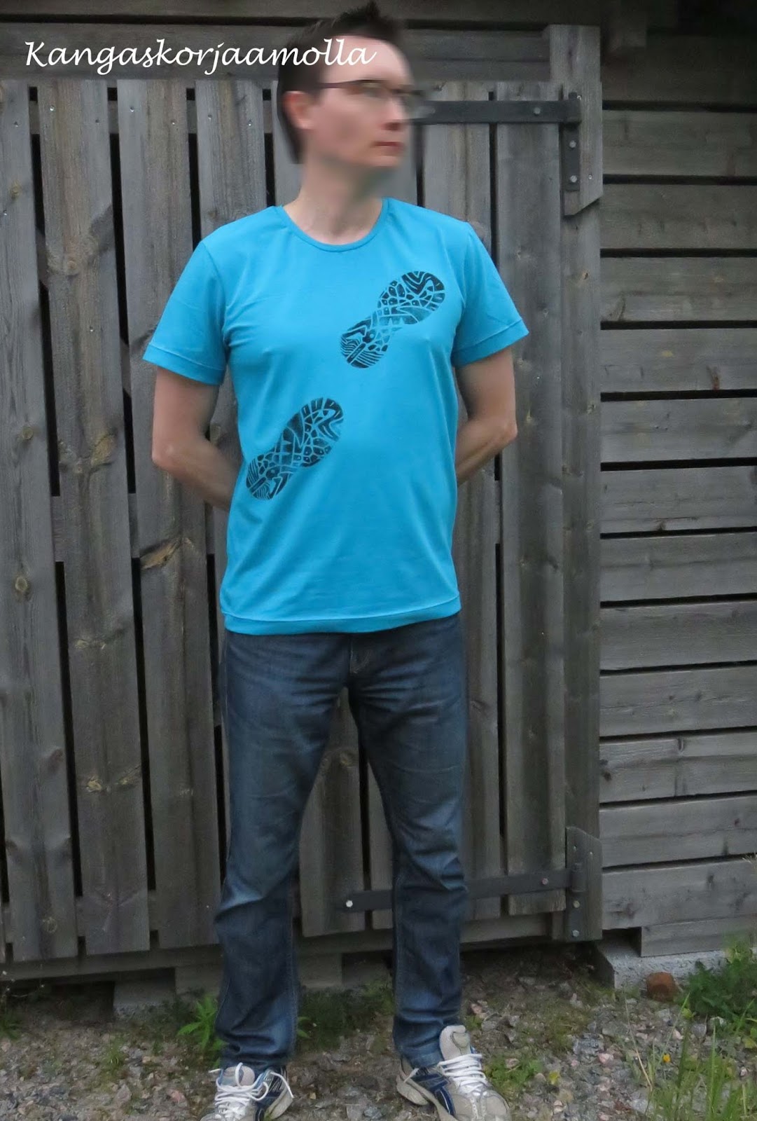 Tässä raitaa on vielä tehostettu ompelemalla vinoruutuja raidan päälle. Tiedättehän Jussi-villapaidan, tämä on nyt sen t-paitaversio :) Lisää miehen t-paitoja on täällä.
