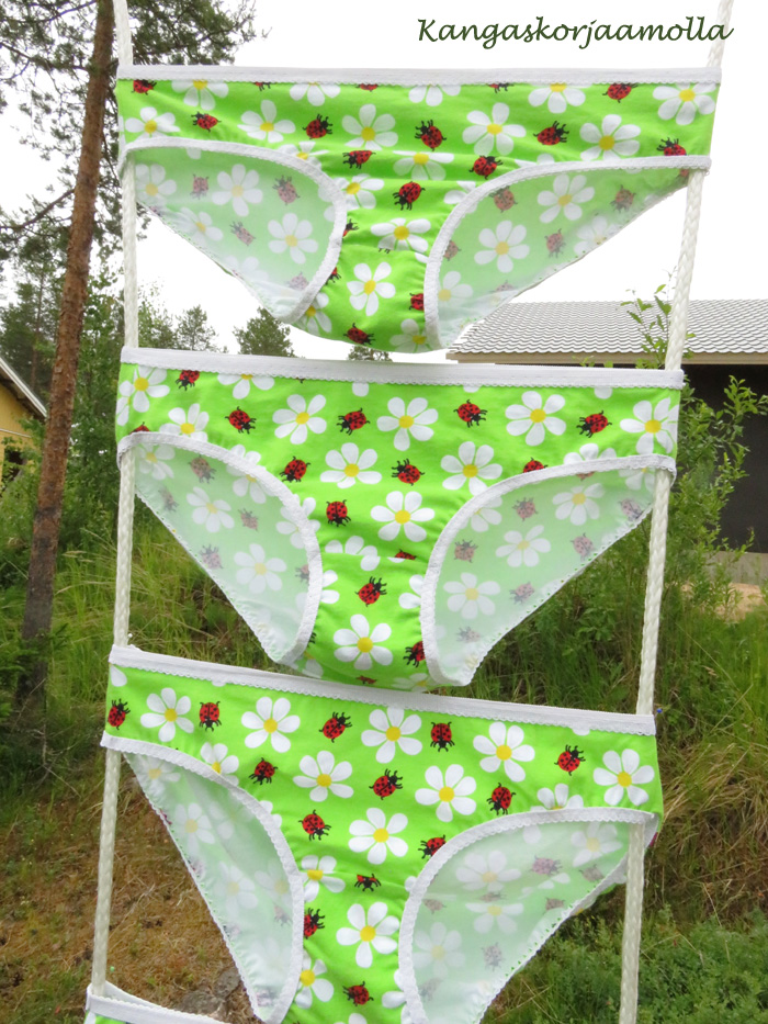 Ompele monta koeversiota. Ompelin ensin yhdet käyttöön, muokkasin kaavaa ja koitin uudestaan. Alushousujen ompelussa sinnikkyys ja kärsivällisyys palkitaan. Sarjatuotannon voi aloittaa vasta myöhemmin. Ompelin kolmet pikkarit ennen kuin sain kaavan hiottua kohdilleen. Sen jälkeen ompelin sarjana viidet pikkarit lisää. Nyt minulla riittää pikkareita viikon joka päivälle ja maanantaille kahdet :D