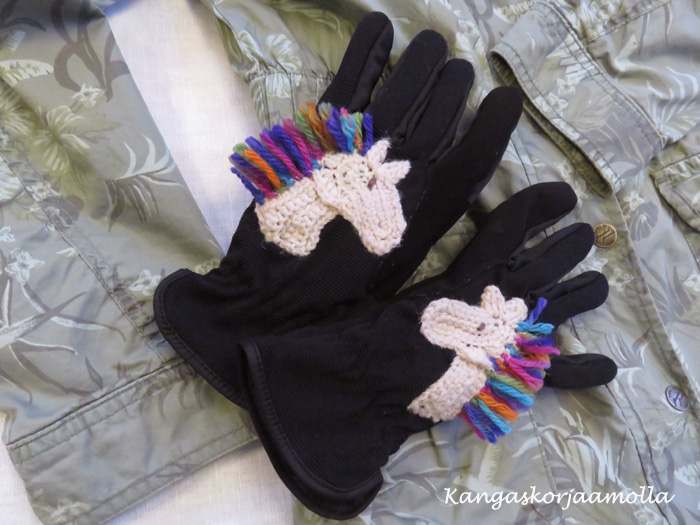 Jämälangat käyttöön! Kun neulomiseen valitsee jonkin teeman, ei edes huomaa, että lapaset on tehty jämälangoista. Yksisarvislapaset kätkevät sisälleen taikaa ja siksi ne voi neuloa minkä värisistä jämälangoista vaan.
